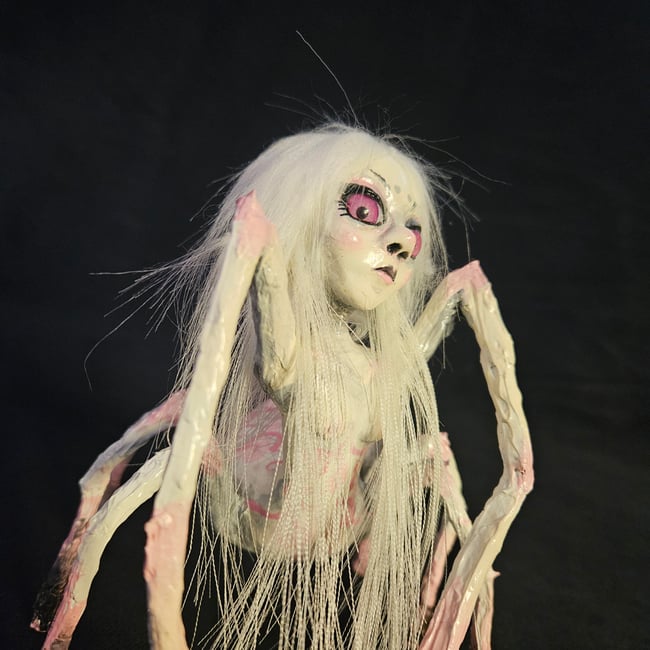 A pair of arachnid sisters, carefully sculpted and painted. Will creep behind furniture and in dark places, peering at you with glassy eyes and scampering on skinny legs.
